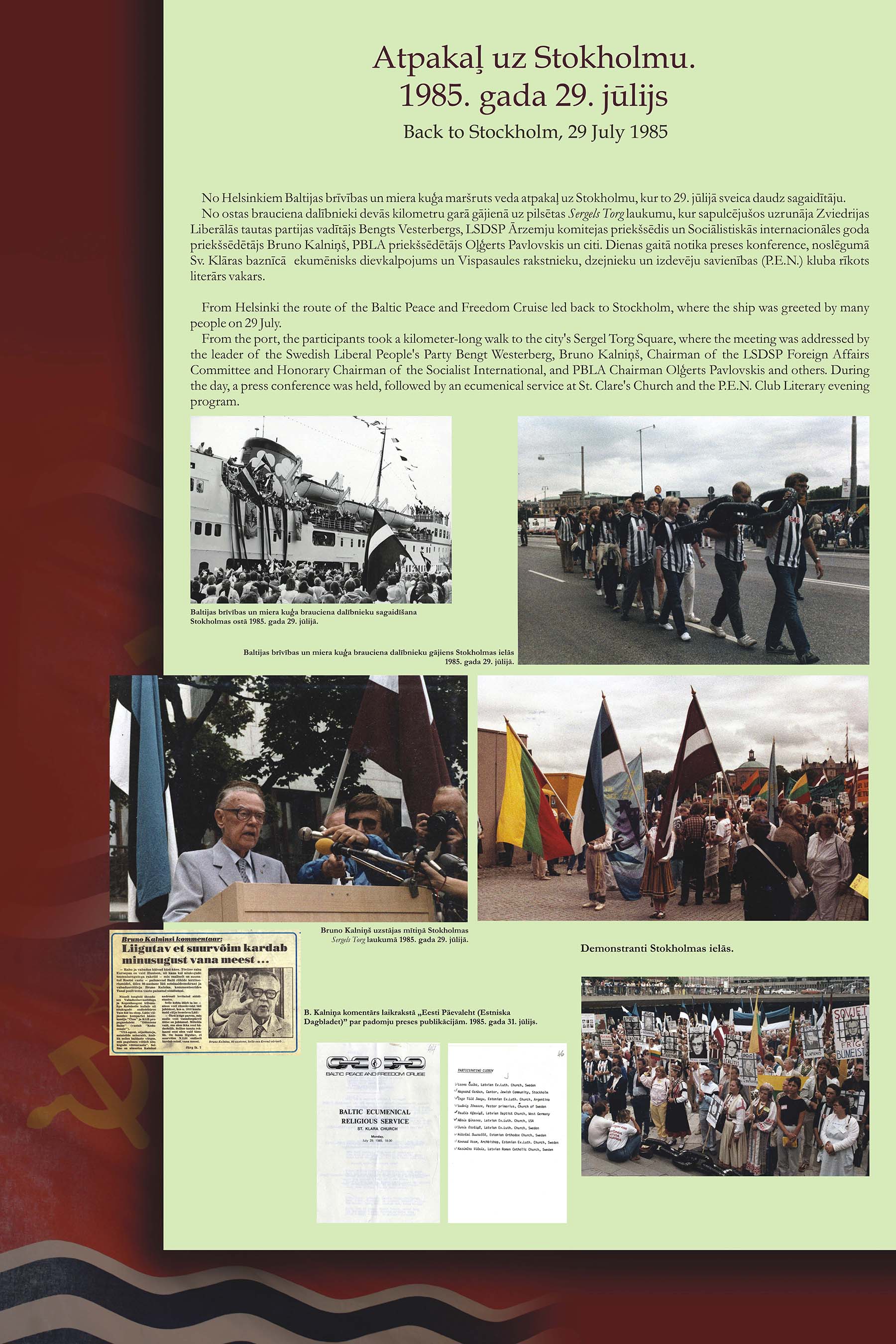 Baltijas brīvības un miera kuģa brauciens Baltijas jūrā 1985.gada 26.-29.jūlijā Brauciena ideja un sagatavošana Baltiešu Tribunāls Kopenhāgenā, 1985.gada 25.-26.jūlijs Brauciena sākums Stokholmā, 1985.gada 26.jūlijs Piemiņas ceremonijas uz kuģa, 1985.gada 27.jūlijs Ierašanās Helsinkos, 1985.gada 28.jūlijs Atpakaļ uz Stokholmu, 1985.gada 29.jūlijs Semināri uz kuģa, 1985.gada 27.-29.jūlijs Brauciena noslēgums, 1985.gada 30.-31.jūlijs Brauciena publicitāte pasaules medijos I Brauciena publicitāte pasaules medijos II